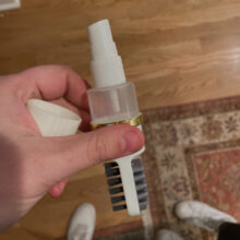 I'm impressed by the convenience of this shoe brush cleaner. Its compact size fits snugly in my hand, although removing and replacing the end caps can be tricky. The spray nozzle works well, and the soft bristle brush effectively removes dirt from tight spots. The 2-sided silicone head is intriguing and gentle on suede, ensuring a uniform appearance. Perfect for quick touch-ups before heading out!