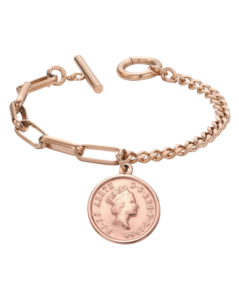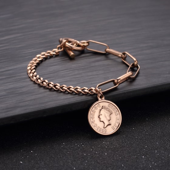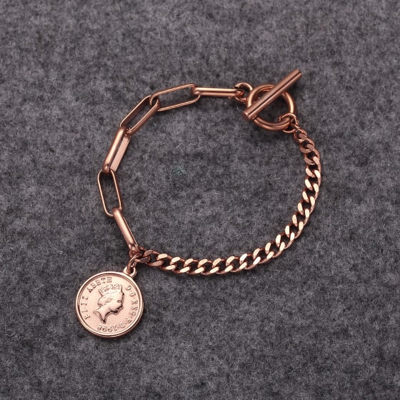 Beautiful bracelet. Links are heavy and secure and the coin charm is unique. Perfect for a gift!
