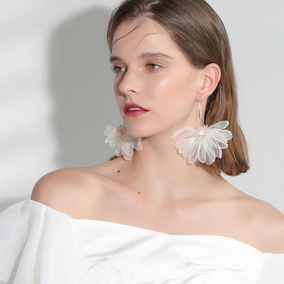 These insanely cute Flower Earrings are made of organza and enchased with rhinestones. Size: 3.9 in.*3.9 in. Weight: 0.53 oz.