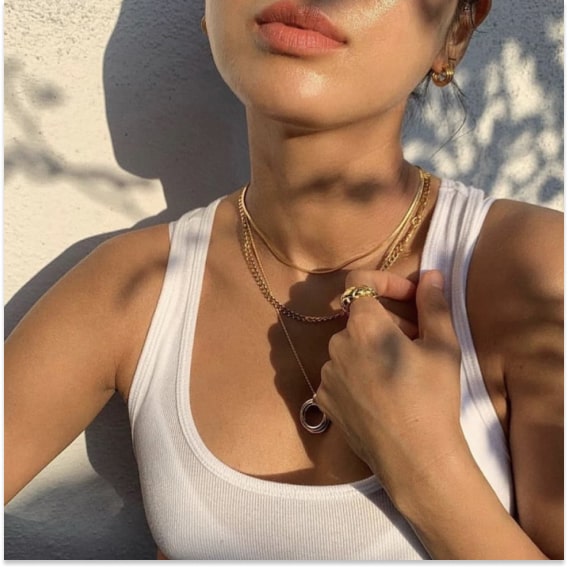 Purchased this necklace for a beach trip and it was perfect! It did not give me any irritation or trouble with the claps. I wore it to the beach, pool and shower and it has not turned. I love it so much it’s a new staple for me!