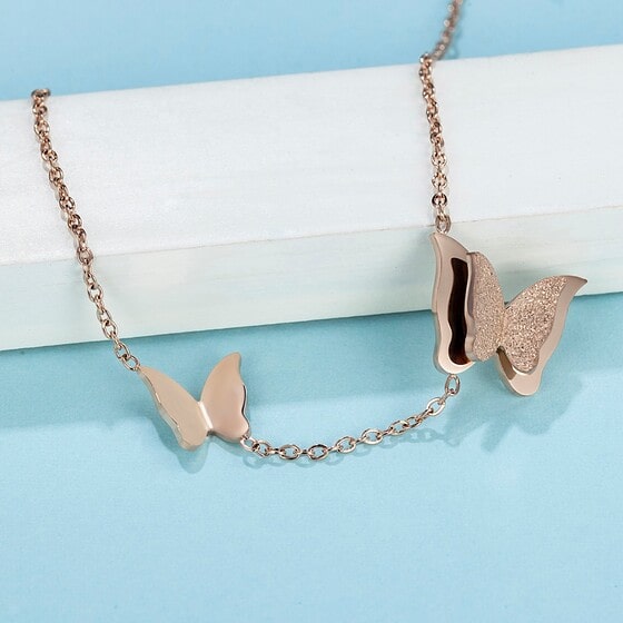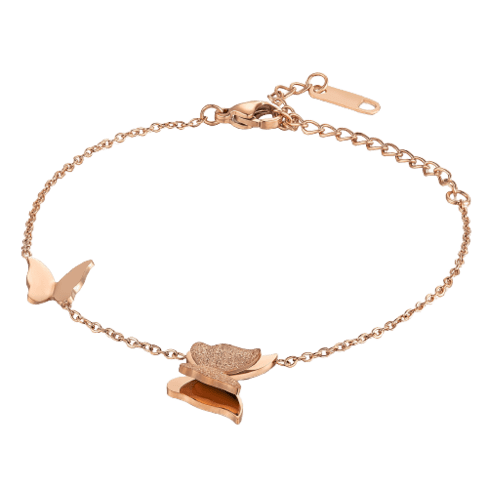 The bracelet is made of stainless steel. It is an adjustable piece of jewelry composed of a flat brass cable chain and connected with a lobster clasp. The bracelet in the golden rose tone is 5.5+2 in. long. The butterfly sizes are: 0.43 in. in height and 0.55 in. in width, 0.35 in. in height and 0.39 in. in width. Weight: 0.14 oz.