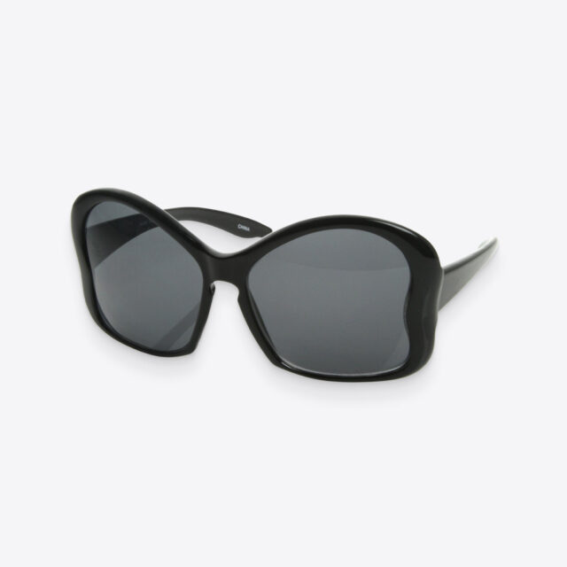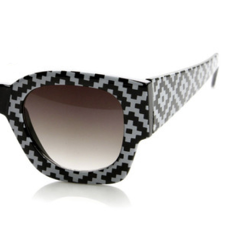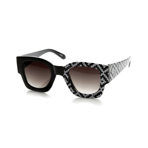 A geometric-inspired black-and-white pattern adorns the right lens while a solid black color covers the left lens. Get a double look in one pair of sunglasses for a unique addition to your sunglasses collection.